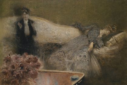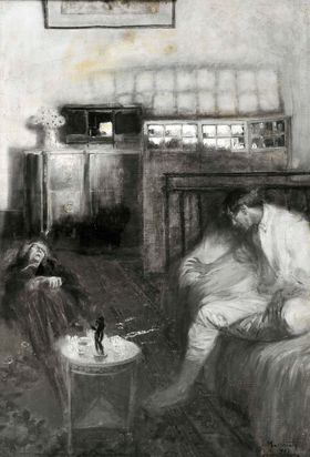 La quinta sezione, dal titolo Paradisi artificiali della Decadenza, a cura di Emanuele Bardazzi, trae spunto da due dipinti iconici eseguiti da Serafino Macchiati durante gli anni parigini, Morfinomani e Paul Verlaine, Bibi-la-Purée e Stéphane Mallarmé al caffè Procope. Il primo, presente in mostra, ritrae una scena ambientata in un salotto elegante con due donne dedite all’uso della morfina detta allora la Fée grise, uno dei vizi più diffusi negli anni della Belle Époque; il secondo è legato invece al consumo di assenzio detto la Fée verte, divenuto piaga sociale dopo un utilizzo dilagante, pubblicizzato da accattivanti manifesti. Attraverso magnifiche opere grafiche sul tema realizzate da grandi artisti come Félicien Rops, Georges De Feure, Albert Besnard e Henry De Groux, il percorso si snoda seguendo un intrigante fil rouge che approda alle incisioni di Jean Veber, Alfredo Müller, Edmond Aman-Jean e Anders Zorn dedicate all’iconografia di due padri spirituali della Decadenza, Charles Baudelaire e Paul Verlaine.