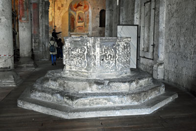 L’interno purtroppo è sostenuto con strutture metalliche che comunque nulla tolgono alla bellezza degli affreschi, al ciborio, alla visione complessiva con i capitelli corinzi e le colonne che ne delimitano le navate.