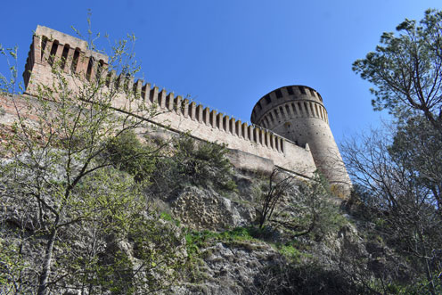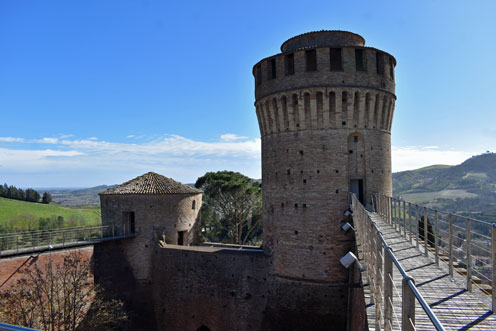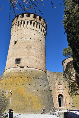 Per una strada erta raggiungiamo la poderosa rocca. Il torrione più piccolo fu eretto nel 1310 da Francesco Manfredi, modificato nel XV secolo e durante l’occupazione di Venezia (1503 – 1509): si costituisce di due torri cilindriche, la più alta e massiccia risale all’aggiunta operata dai Veneziani, raccordate alla cinta di mura con i beccatelli che formano un ampio spiazzo all’interno con i raccordi tra le due torri. Vi si accede per strette scalette a chiocciola e si prosegue seguendo l’itinerario indicato fino a farne il giro completo avendole attraversate entrambe. La struttura del torrione ha cinque piani, accoglieva nei primi due l’acqua, nel terzo l’abitazione del capitano del presidio, nel quarto il forno e la camera da letto, nel quinto la camera della tortura e la prigione.