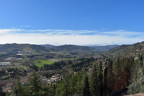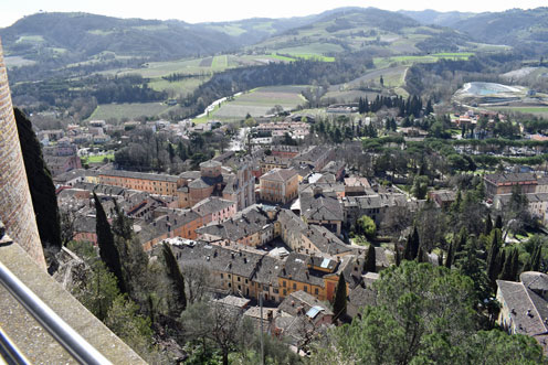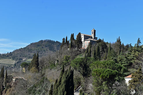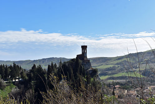 Da quassù si domina il paesaggio circostante: la Torre dell’Orologio, il Santuario di Monticino, in basso la Collegiata dei Santi Michele e Giovanni Battista, progettata dal fiorentino Gherardo Silvani nel XVII secolo.